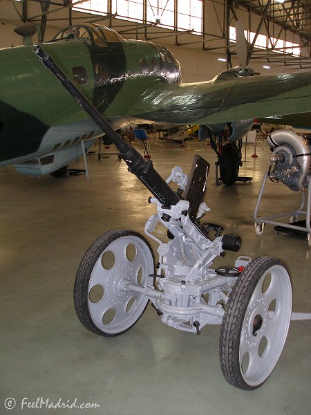 Museo del Aire. An anti-aircraft gun. The bomber in the background is a CASA 2111, the Spanish version of the German Heinkel He-111 H-16. Date: March 4, 2007